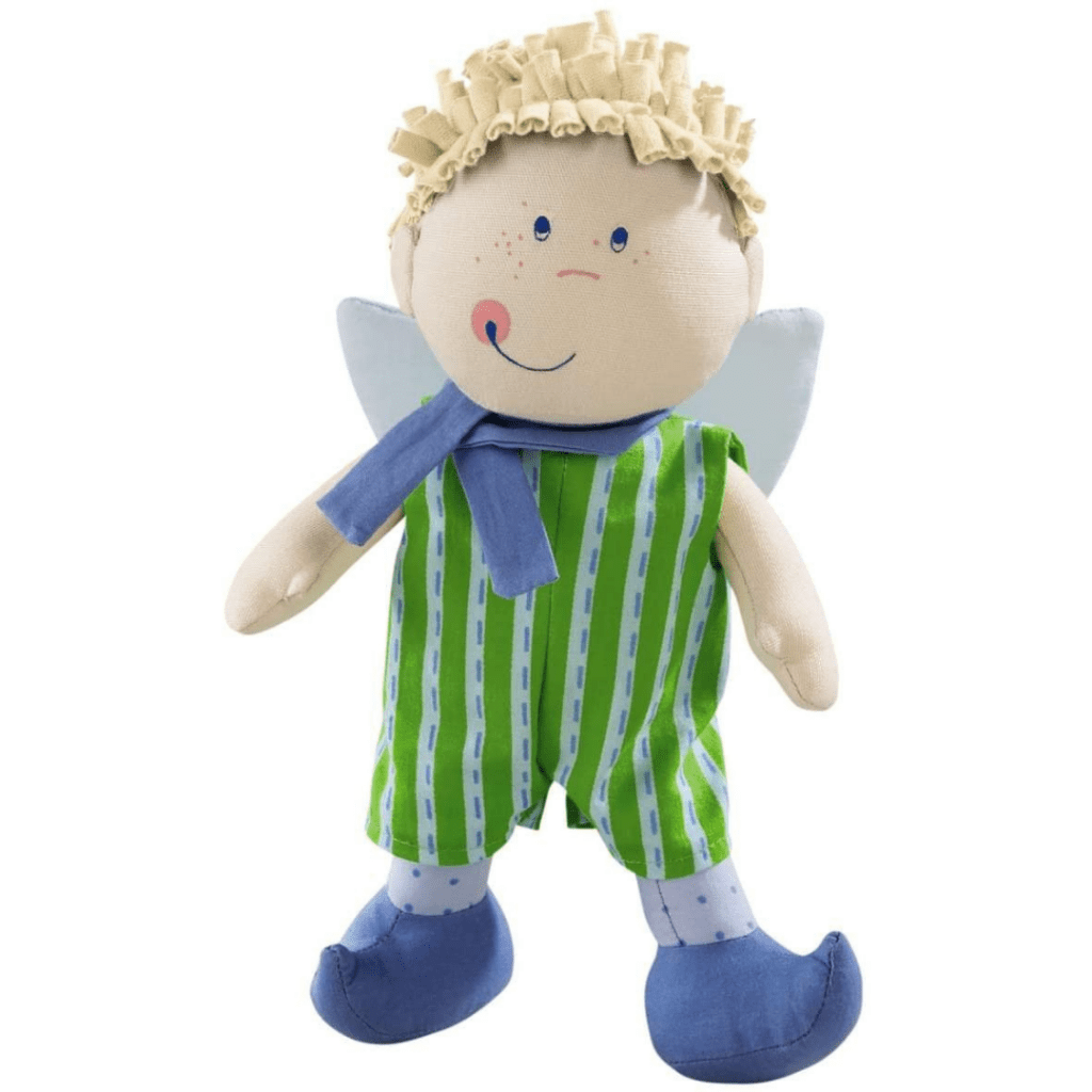 What a beautiful birth / baby shower present by HABA. A friendly smiley face, stripy shirt, pointy boots and wings too. His soft body makes him great for hugs and he is also made with organically farmed cotton! This cute guardian angel protect all new born babies from their very first day and accompany them while growing up!