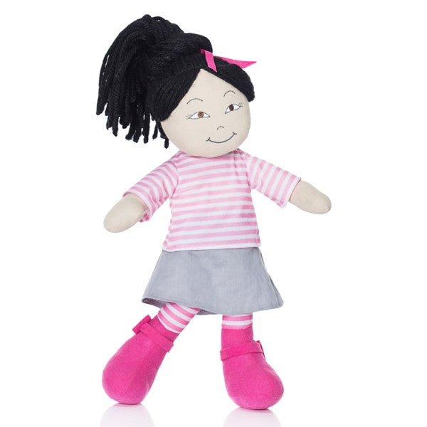 Dolls have the tendency to trigger emotions, and this rings true especially for Minimondos dolls as they have such distinctive looks, clothes and amusing little personalities. The Mia soft doll can help to develop creative role play sessions and a more real sense of companionship. She is soft and cuddly, and makes a perfect bedtime buddy. Constructed using the finest materials and techniques, the body of each doll is made with 100% cotton, the clothes are a combination of cotton and polyester fabrics and the dolls are carefully filled with a high quality synthetic fibre.