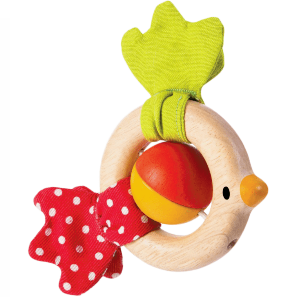 This gorgeous little Bird Rattle is the great for grasping, discovering the scrunching sound of the green ribbon on top, turning the ball in the middle while listening to the rattle and feeling the texture of the polka-dot ribbon. These features will encourage the exploration of sound and develop fine motor skills as well as hand eye coordination whilst grasping this Bird Rattle